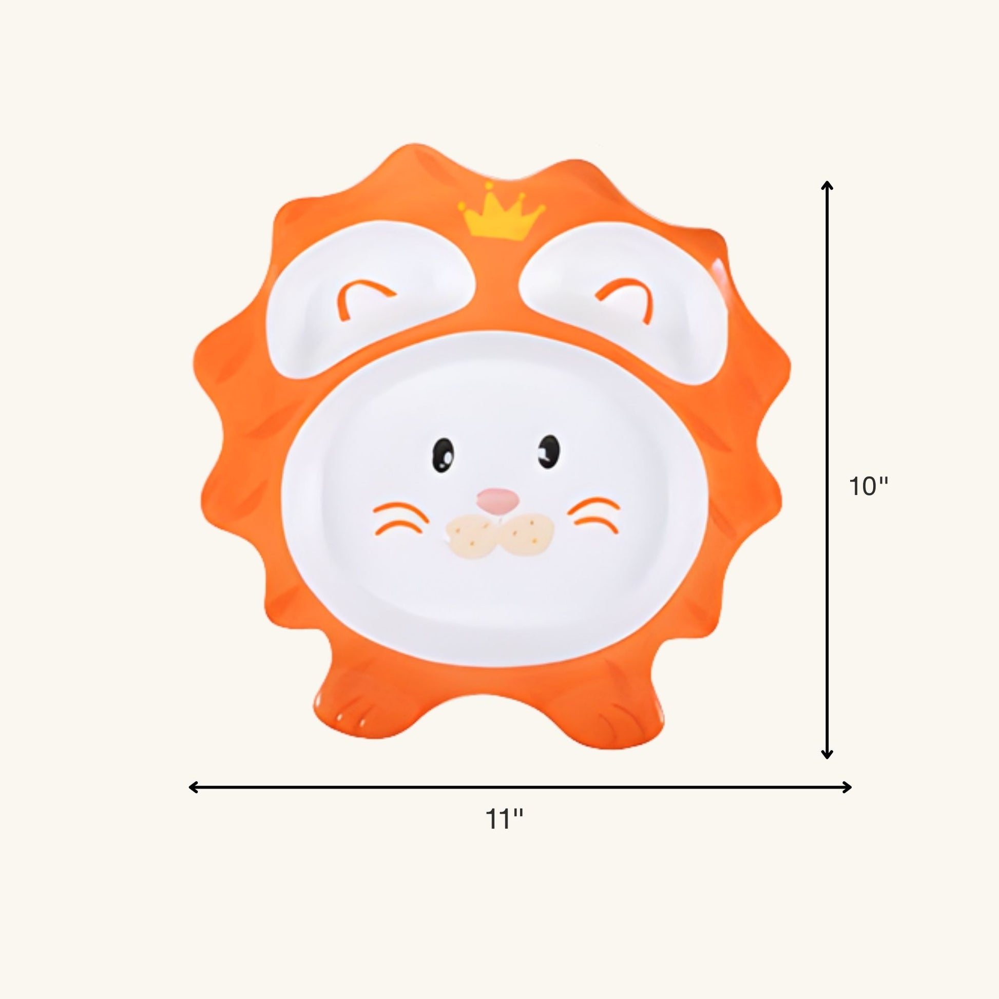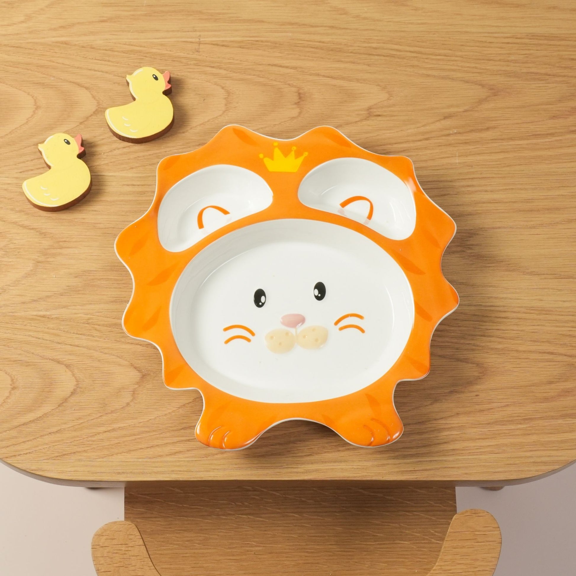 This regal ceramic plate is designed in the shape of a cheerful lion with a vibrant orange mane and a small, charming gold crown detail. It serves as a three-section divided plate, with the lion's face forming the large central compartment, and the ears/forehead area forming two smaller compartments. This design is perfect for keeping main courses, sides, and snacks separate, making mealtime a fun and royal safari adventure for little ones.